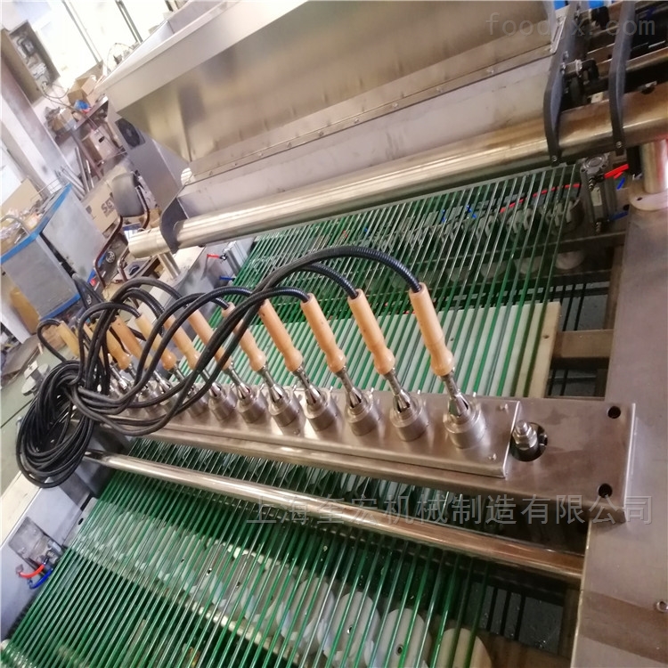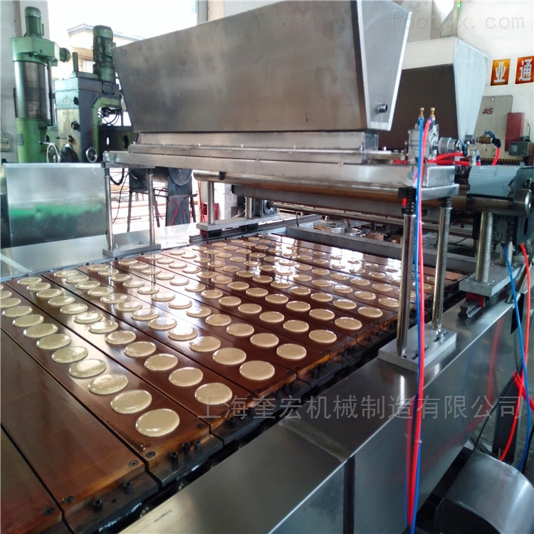自动充气打发浆料--注浆--烘烤--翻饼--落饼--整理--翻饼--注馅--烙图案--合饼--冷却杀菌--包装.